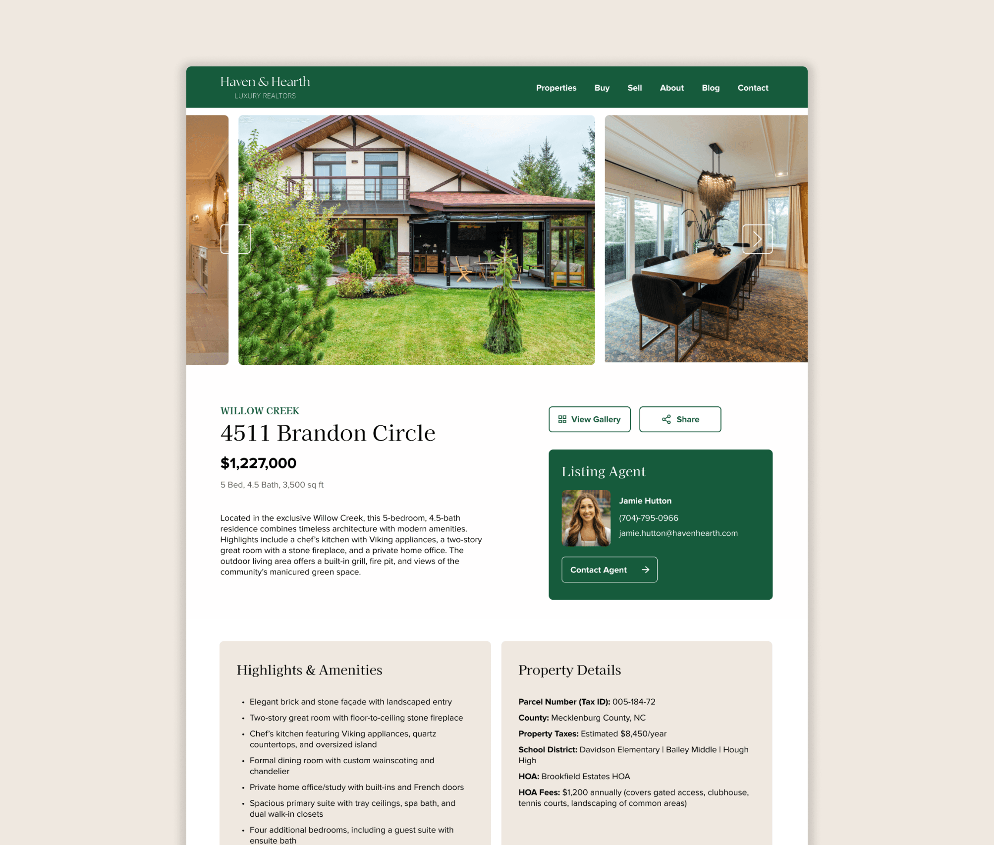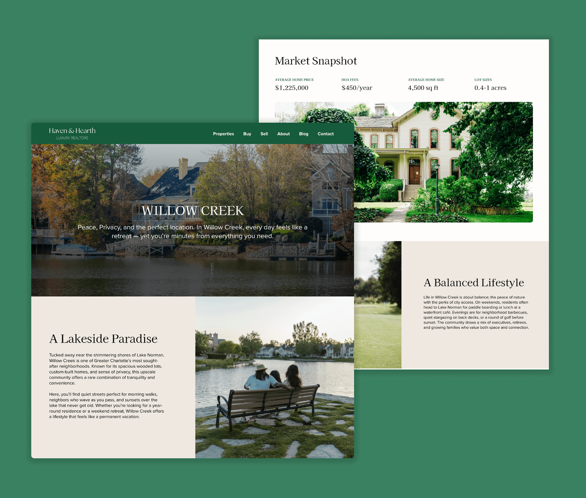 Haven & Hearth Realtors, a boutique real estate firm in the Greater Charlotte area, needed a refreshed website and digital brand to reflect their luxury, concierge-style service to help them better stand out in a competitive market. I crafted a custom website and brand system that focused on the sense of community and lifestyle each neighborhood had to offer. Our goal was to position the firm as an approachable yet sophisticated expert that helps potential buyers and sellers feel confident in choosing them as their trusted real estate partner.